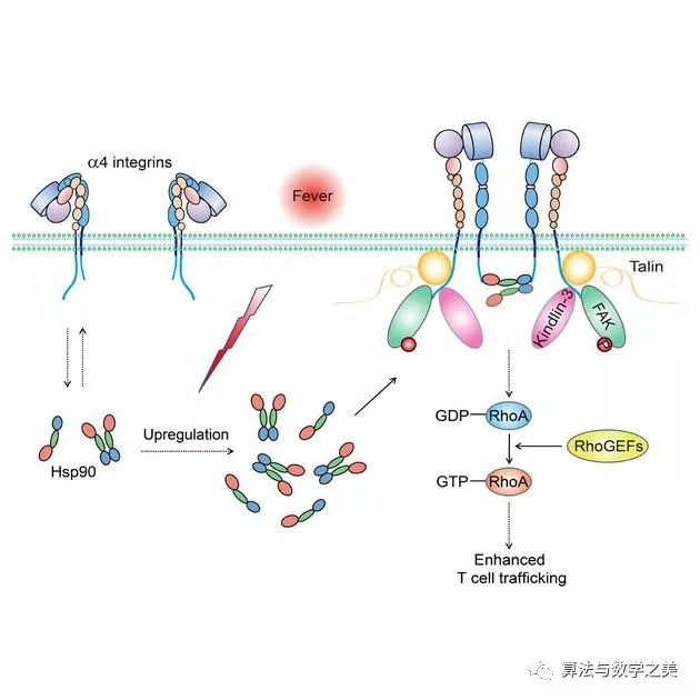 图示:发热通过Hsp90-α4整合素热感应信号通路促进T淋巴细胞迁移