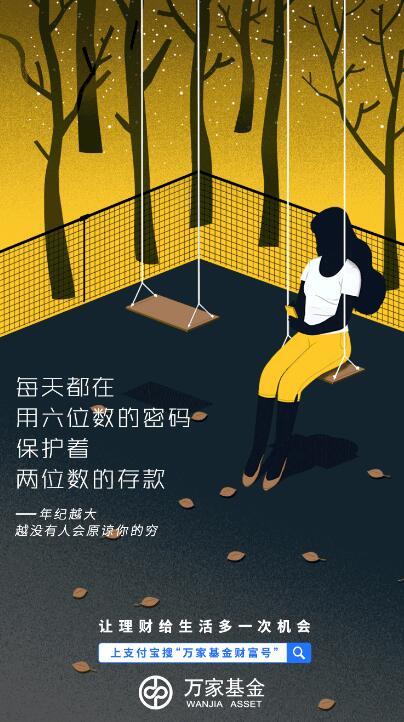 这组文案由16副风格统一的人物海报组成,并配上了“你每天都很困,只因为你被生活所困”、“每天都在用六位数的密码保护着两位数的存款”的文字,引出“让理财给生活多一次机会”的主题,进而达到“上支付宝搜XX基金财富号”的推广目的。