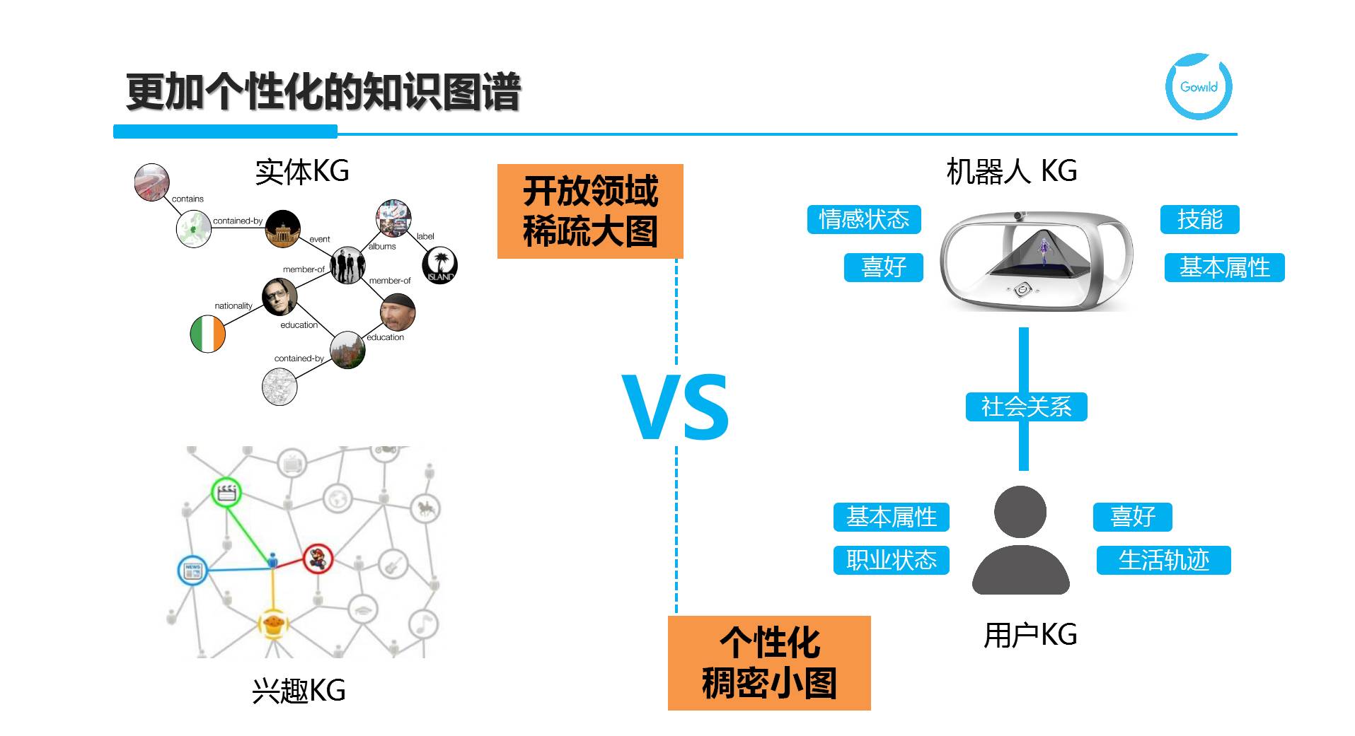 需要强调的是,无论是个性化小图还是开放域大图,都不是独立存在的,需要将它们融合在一起,才能发挥更大的价值。机器人喜欢吃的食物则需要和实体KG中的食谱图谱关联,而与用户形成经纪人、好友等社会关系,同时爱好方面则和兴趣图谱又关联在一起,可以实现机器人社交、机器人-用户社交和用户社交网络的统一连接。
