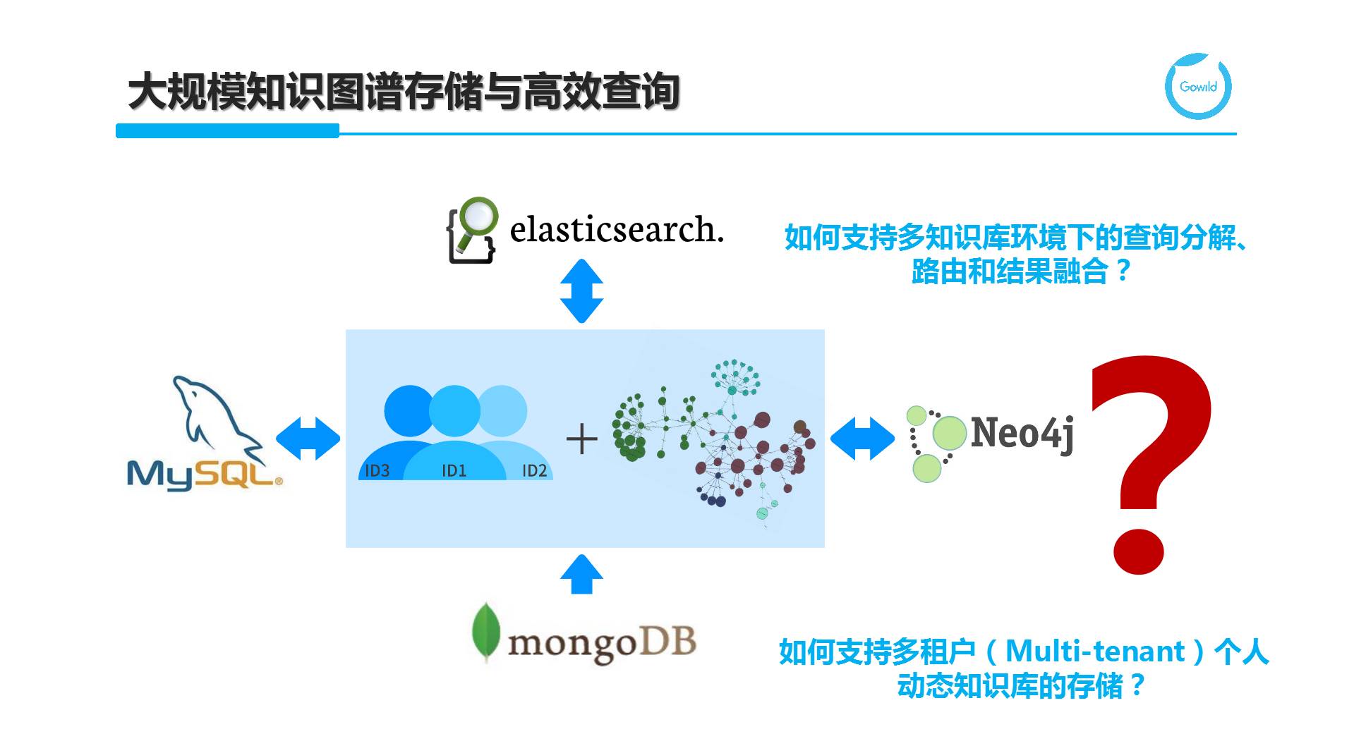 从工程应用的角度,我们更愿意站在巨人的肩膀上,选择一个现有数据库或几个数据库的组合来形成高效的图谱存储。注意:这里所谓的存储,不仅仅是将知识存放的问题,而是考虑存储之后是否可以根据图谱的规模、读写特点和查询推理等基础在线操作的效率等多个因素来考量。MongoDB,作为面向文档(Document Oriented)的NoSQL代表,他支持无模式(Schemaless)的数据建模方式,即不要求一开始就将Schema都确定,而可以按需进行添加或修改。这对于需求经常变更或一开始对领域不是完全了解的情况下,支持自底向上方式的知识管理。不过MongoDB仅支持数据库级别的锁,写入速度受限。对于读并发的提高,可以使用基于数据分片(Data Sharding)的分布式版本。关系型数据库MySQL应用广泛,也被用于Apache Jena(HP开源的RDF数据库)中TDB的存储引擎。而ElasticSearch支持图谱上的简单模式(如单关系或链式)查询,适合如Facebook Graph Search或聊天机器人中大部分口语对话,因此也是面向聊天对话的知识图谱存储方案之一;Neo4j是知名的图数据库,不同于RDF数据库,它的数据模型是属性图(property graph),基于图遍历(graph traversal)来实现各种查询功能,对于大部分熟悉面向对象编程的工程师来说非常容易上手。基于上述任何一个数据库或多个数据库的组合来满足知识图谱的管理都是工程做法。从研究的角度来说,希望做一个统一的存储和查询引擎,需要支持多租户(multi-tenant)环境下的海量个人和机器人知识图谱管理,以及融合个人图谱和全局知识上的查询分解、分布式环境下的查询路由和子查询执行,以及结果融合等操作。