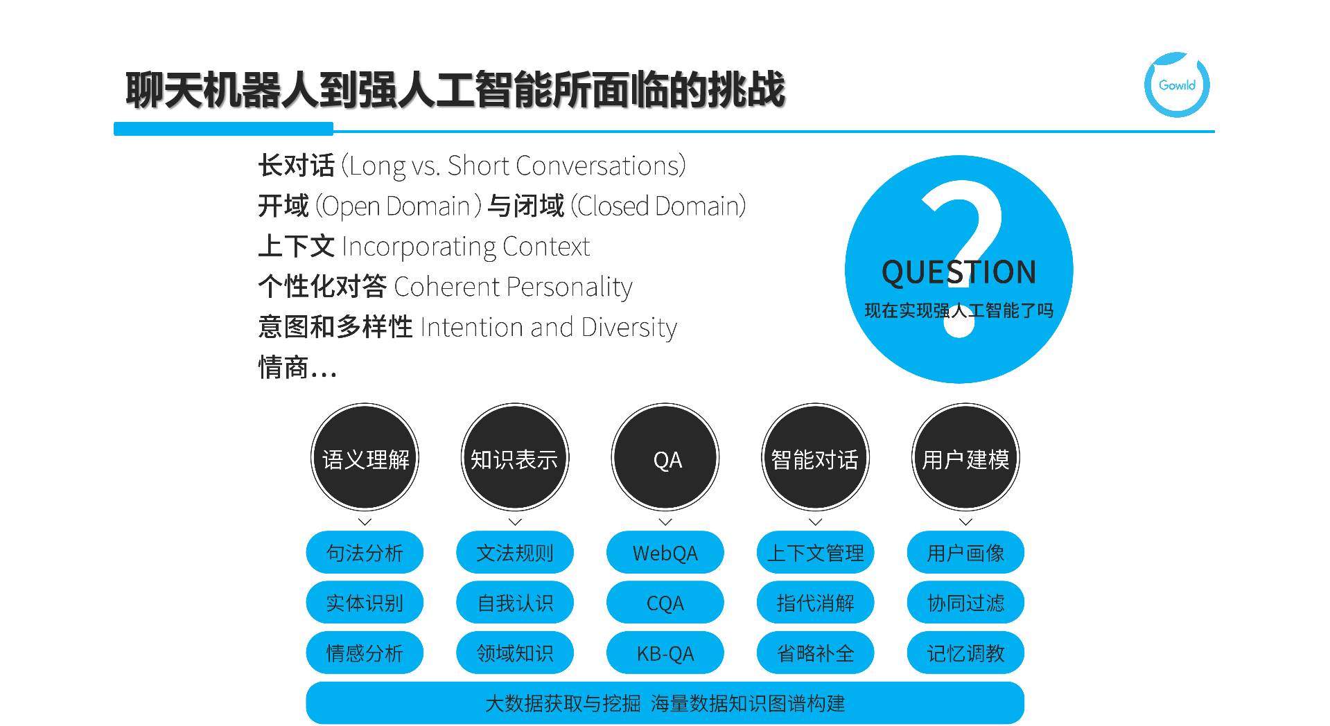为此,我们需要基于大数据获取与挖掘来构建海量知识图谱,并在此基础上,重点在语义理解、知识表示、QA、智能对话和用户建模等5个方面进行深入的研究和技术落地。