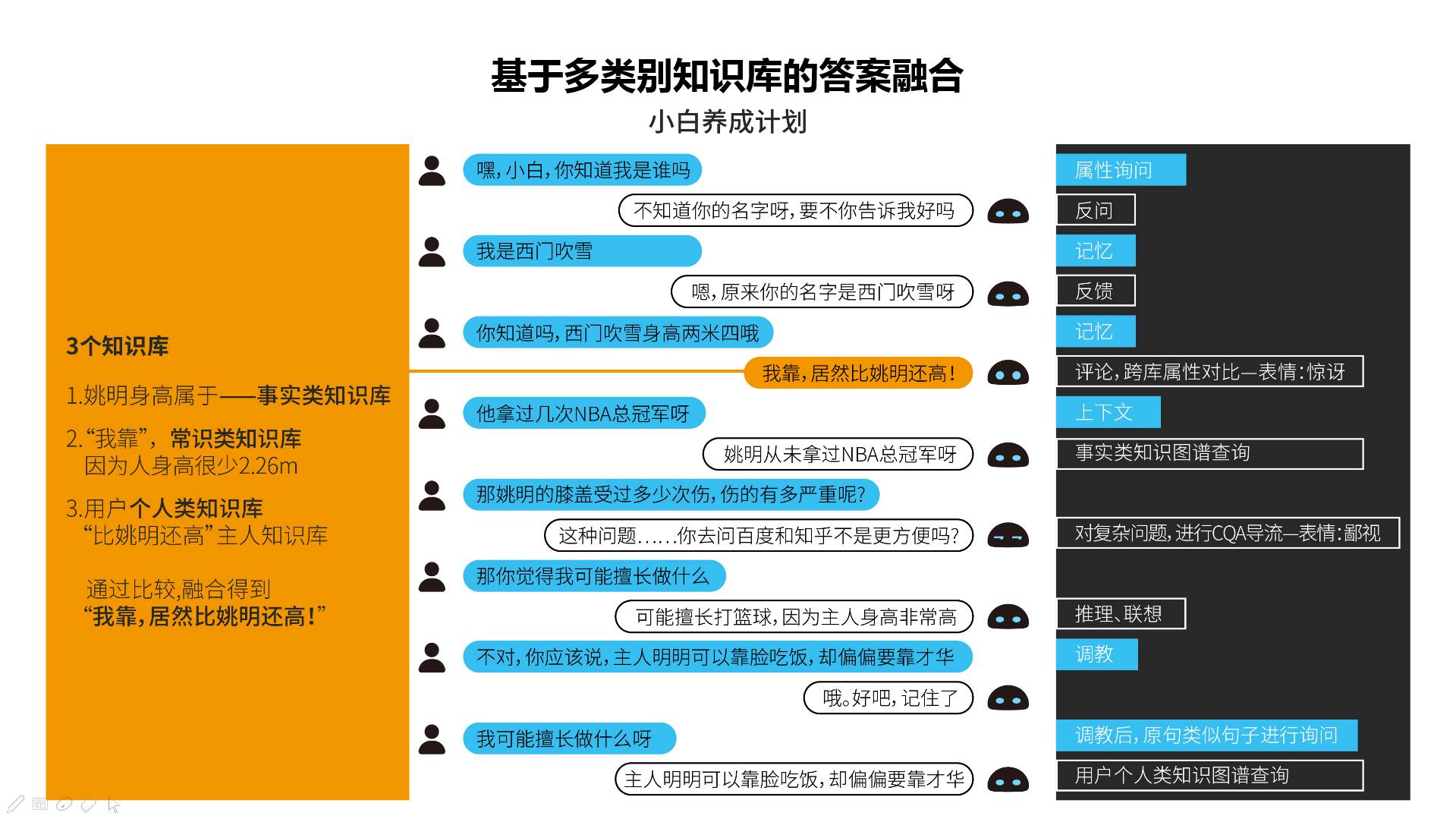 知识问答中非常有挑战的是Multi-KB环境下的问答。这对问句分解和知识源选择等都提出了更高的要求。更有挑战的是:不仅仅一句很复杂的话会涉及多个KB,即使对于很简单的话,往往在聊天的多轮交互中,会逐步涉及不同方面的KB,甚至需要在某个看似不经意的回复中用到某个KB。在研制小白的多轮对话中,需要考虑属性询问、反问、记忆、反馈、基于跨库属性比对后的评论,基于上下文的问答、事实类知识图谱查询、对复杂问题的导流、推理联想,调教以及用户类知识图谱的查询等。例子“我靠,居然比姚明还高”就是一个多知识库问答之后的回复生成。其中,姚明身高属于事实类知识库、“我靠”等惊讶的回复,是通过常识知识库了解到很少有人身高超过2.26米,而通过用户个人知识,其身高数值比姚明还高,而返回“比姚明还高”的回复片段,最后通过融合,得到最终的返回。