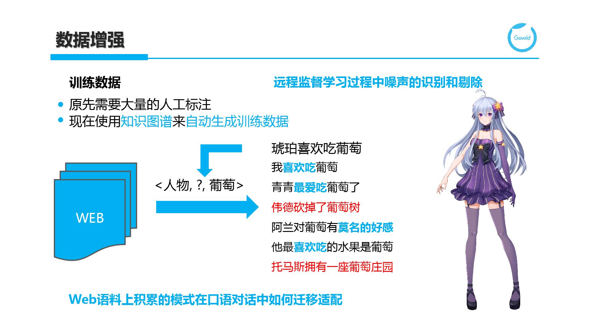 具体来说,通过将知识图谱与文本语料库关联,形成大量弱标注数据。这在关系抽取或事件抽取等任务上应用广泛。例如,对于三元组<琥珀,喜欢吃,葡萄>,通过一定的泛化,我们将琥珀转换为PERSON,即在Web上收集PERSON和葡萄共现的描述片段,这些描述片段可能代表人物喜欢吃葡萄的特定模式(蓝色例句),也可能代表噪声(红色)。如何通过聚类分析中的异常点检测或噪声建模等方式将弱标注语料中的噪声识别并剔除。当然,包含一定比例的随机噪声,对于模型训练是一定帮助的,可以保证模型具有一定的泛化能力和鲁棒性。使用Web作为关联的语料库,主要看中Web上描述比较多样化,且信息具有冗余性,可以在保证覆盖率的同时确保数据的分布贴近真实情况。然而对于以语音作为主要交互方式的口语化聊天对话场景,我们仍然需要考虑从Web语料上学习到的模式或训练得到的模型如何进一步迁移适配。