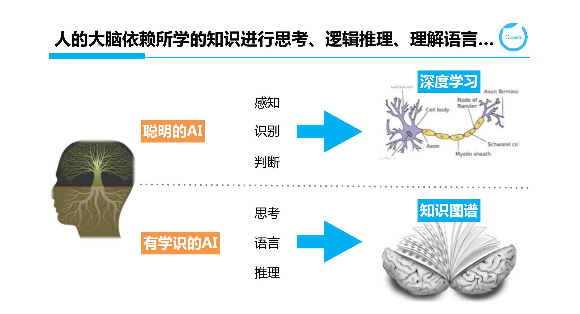 事实上,深度学习旨在构建聪明的AI,在感知、识别和判断等方面提出了各种智能算法(smart algorithms);而知识图谱则希望构建有学识的AI,为思考,语言理解和推理等提供智能数据(smart data)的支持。因此,这两者是相辅相成的。