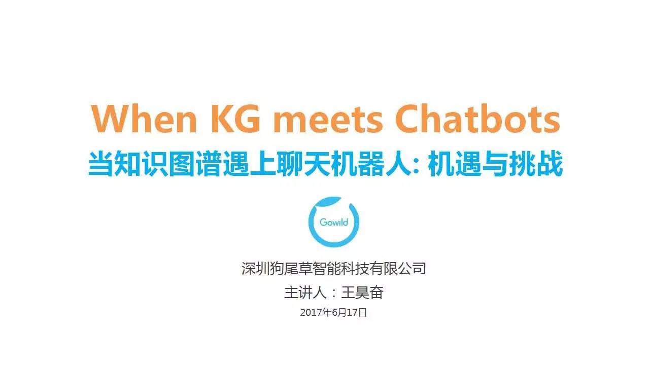 大家好,今天我演讲的题目是 When KG meets Chatbots,即当知识图谱遇上聊天机器人。具体来说,我们主要探讨一下,在聊天机器人(Chatbots)中,知识图谱(Knowledge Graph,KG)将如何融入,起到重要的支撑作用。