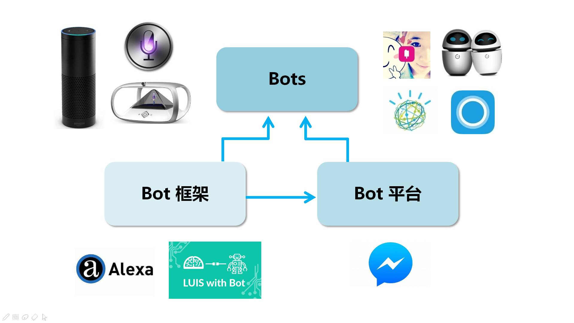围绕Bots生态圈,有些在做实际的Chatbots,既有硬件形态的Amazon Echo及狗尾草公司推出的公子小白和Holoera等,又有纯软件的如苹果的Siri和微软的小冰等。除此之外,为了加速实际Bots的研发,不少巨头或创业企业开始对外提供Bot框架(Bot Framework),以SDK或Saas服务的形态供第三方公司使用来构建特定应用和领域的聊天机器人,这里的典型代表包括支持Echo的Amazon Alexa和微软推出的包含在Cognitive Services大框架下的LUIS with Bot等。更进一步,除了提供开发Bot的API,Bot平台(Bot Platform)进一步考虑开发得到的Bot部署到一些常用平台中如微信或Facebook等。