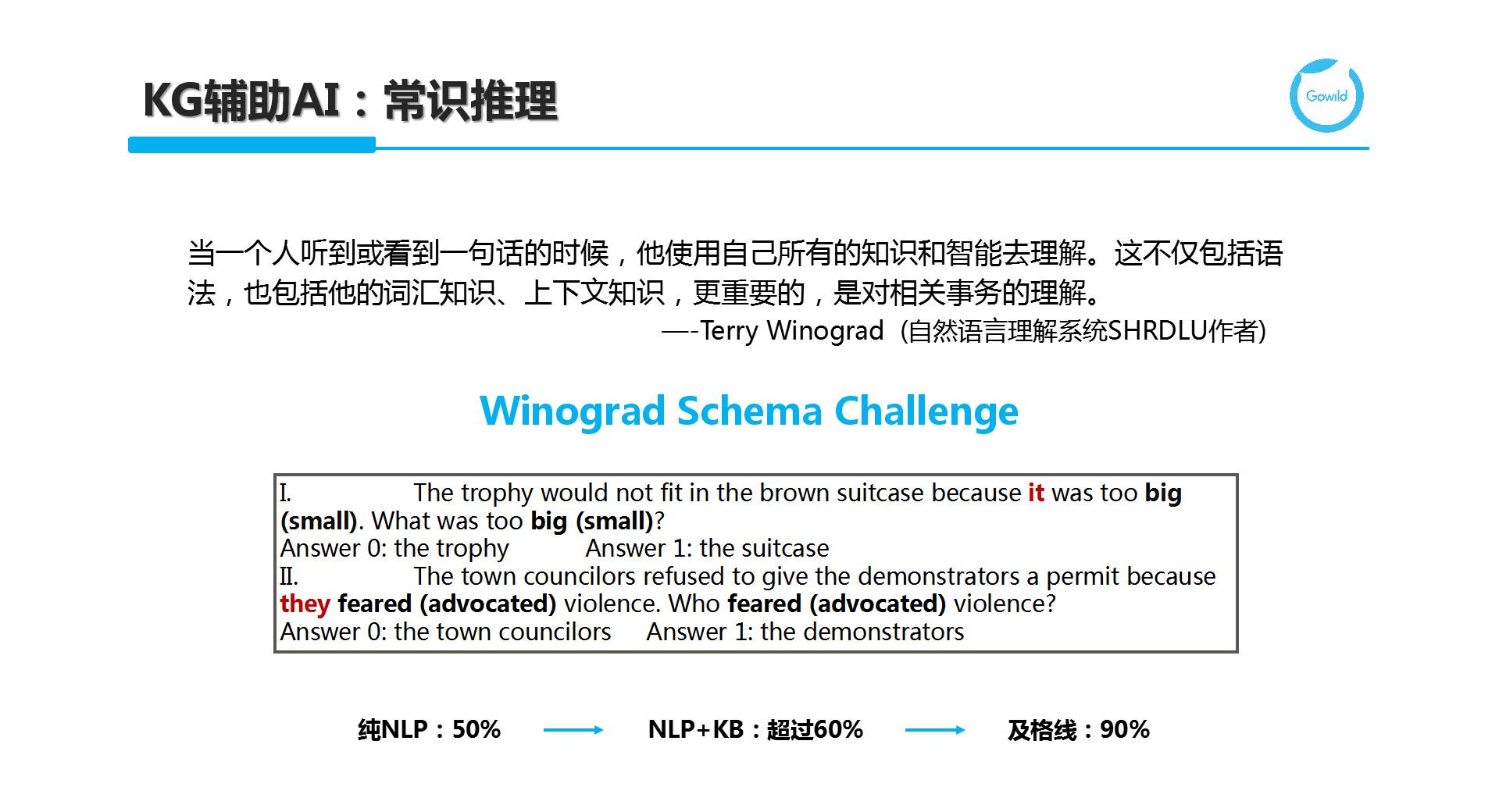 KG也可辅助通用人工智能(Artificial General Intelligence,AGI),即在常识推理方面起到作用。过去人们常用图灵测试对机器的智能进行评估,近年来,Winograd Schema Challenge逐渐进入大家的视线。