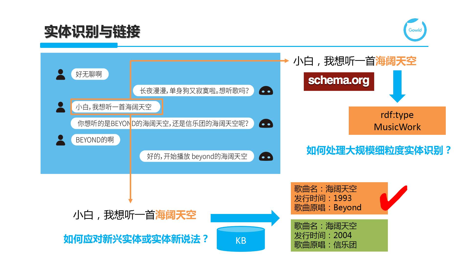 第一个KG在线应用叫实体识别和链接。实体识别称为Named Entity Recognition,简称为NER。在传统NLP任务中,仅能识别PERSON(人物)、LOCATION(地点)、ORGANIZATION(组织机构)、DATE(时间日期)等有限类别。在实际应用中,NER的主要挑战在于识别大量细粒度实体类型,比如以Schema.org作为实体类别的分类体系,这里有很多标注数据充足的大类,也有很多缺乏标注数据的小类,如何保证在小类上的识别准确率。此外,分类体系是有层次结构的,如何保证底层的细粒度类别上有令人满足的识别率。例句“我想听一首海阔天空”中的“海阔天空”通过NER任务可以识别为是一个音乐作品。仅仅这样是无法执行对话意图“音乐点播”的,我们需要进一步将候选链接到知识图谱中的给定实体,这一过程称为Entity Linking。这里的核心在于歧义消解,一般借助于候选周围的其他实体或用语作为上下位来帮助去歧义。如果如例子所示,仍然无法明确是哪个实体,可通过反问来引导用户来给出更明确的实体指引。在实体链接过程中,我们所面临的挑战在于如何应对新兴实体(Emerging Entity)和实体的新兴说法(各种新说法和别名)。