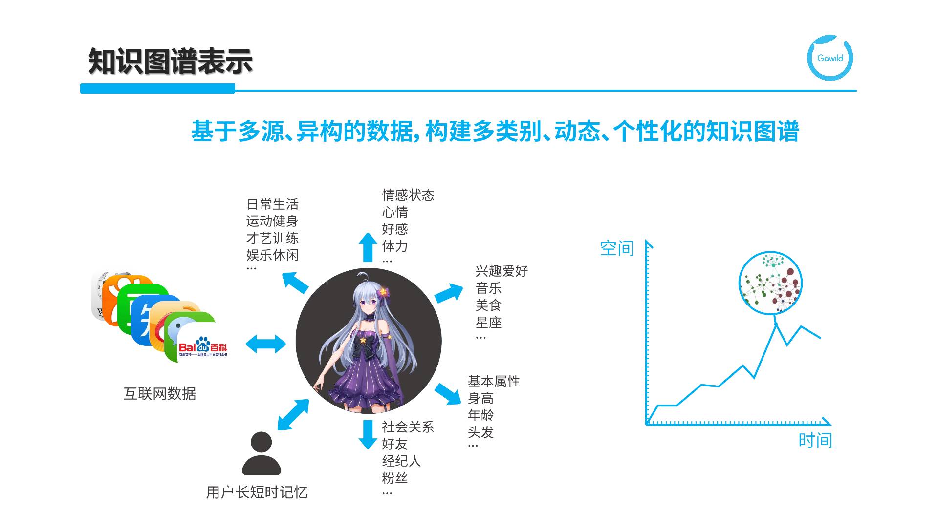 首先,我们需要基于不同来源异构的数据来构建包含多类别且体现动态和个性化的知识图谱。这其中包括来自互联网的数据来刻画世界知识,用户数据来刻画画像知识,以及针对机器人的各种基本属性、社会关系、情感状态、兴趣爱好、以及日常生活等静态和动态知识。而我们得到的融合图谱是时空坐标中针对特定交互场景和时间节点的一个镜像。
