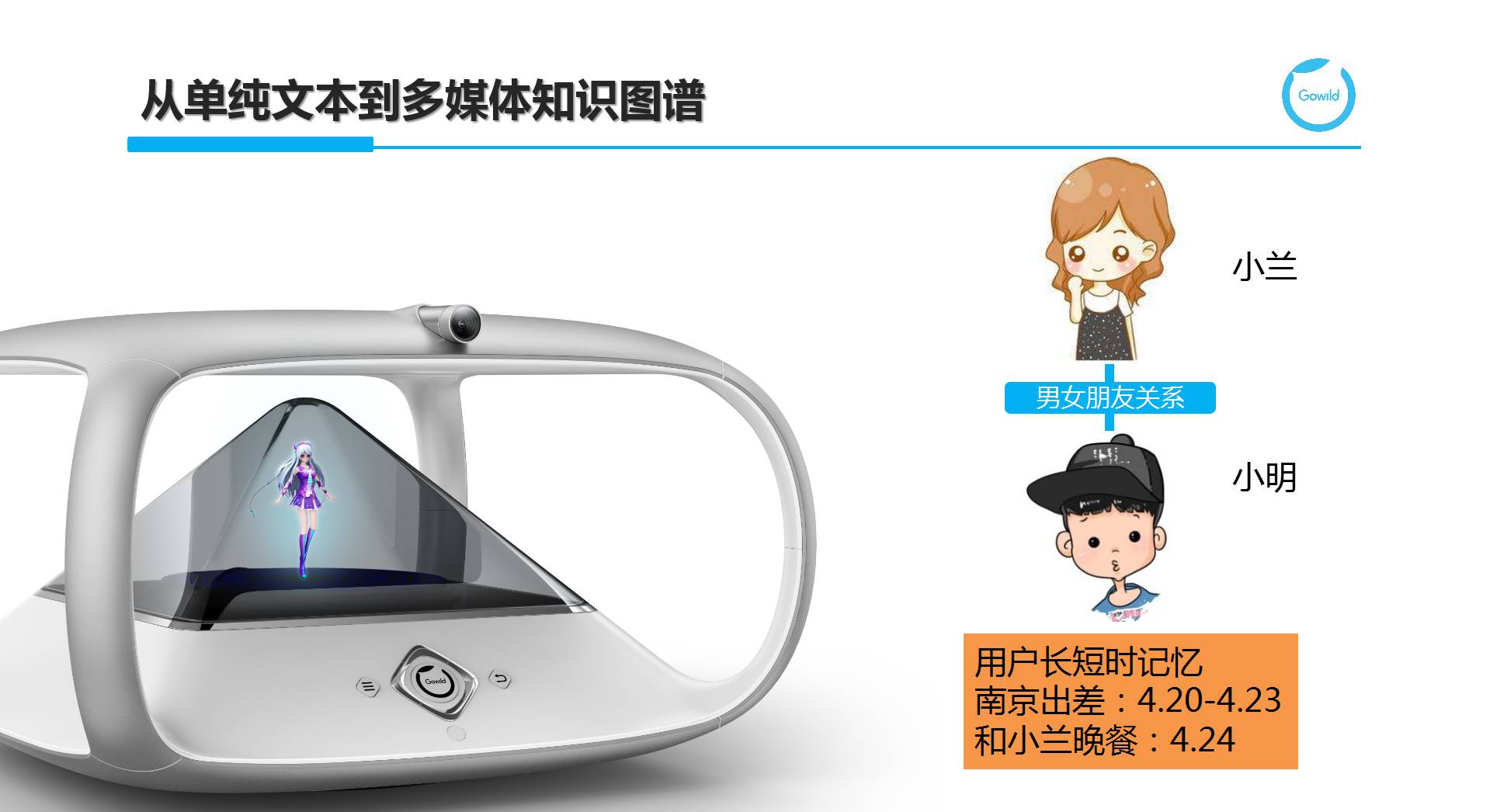 但是这里我想强调的是对于用户图谱这样更新频度非常高且很稠密的KG,多媒体知识的引入能帮助机器人从更多的维度来了解用户,并提供诸如Visual QA等潜在的问答服务。例如,小明正在和琥珀进行交互,通过摄像头识别出当前交互的用户是小明并根据小明的图像与用户ID的关联,进一步得到其长短时记忆,了解到他在4.20到23号期间会去北京出差,而4月24号要和小兰共进晚餐。此时,通过用户图谱中的社交关系了解到小兰是小明的女友,当我们需要进一步了解小兰长什么样时,或者当小兰出现在琥珀面前时,需要可以认出小兰,这时也需要用到我们提到的多媒体知识图谱。
