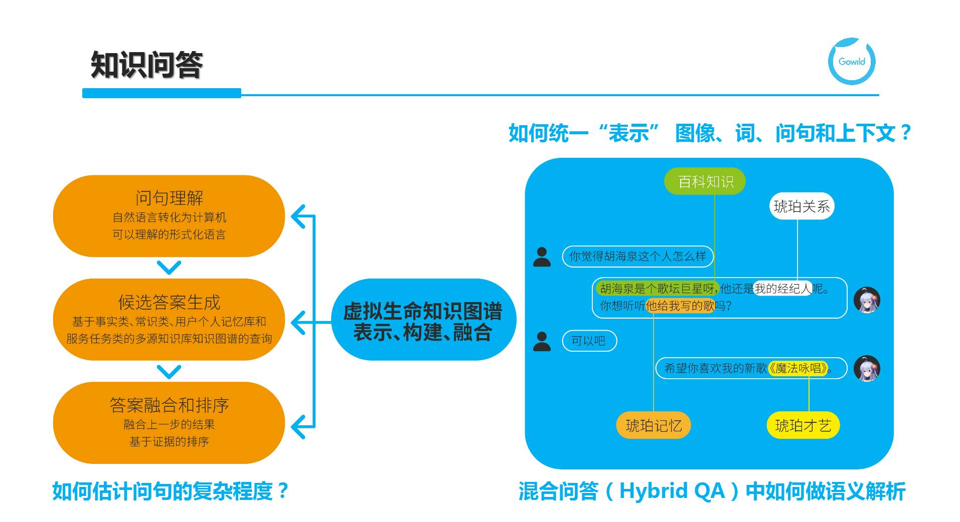 1)如何统一对实体、问句、图像、上下文进行统一的表示,映射到同构的语义空间中?2)知识库永远不可能是完备的,如何从KBQA扩展到支持知识库和Web的混合QA场景下,并提供精准的数据源选择和语义解析?