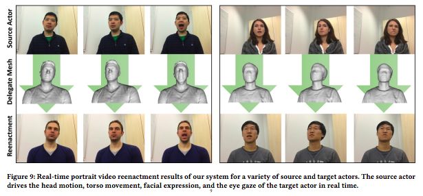 研究人员在论文里将这个系统称为“首个人体肖像视频的实时的源到目标(source-to-target)重演方法,实现了躯干运动、头部运动、面部表情和视线注视的迁移”。