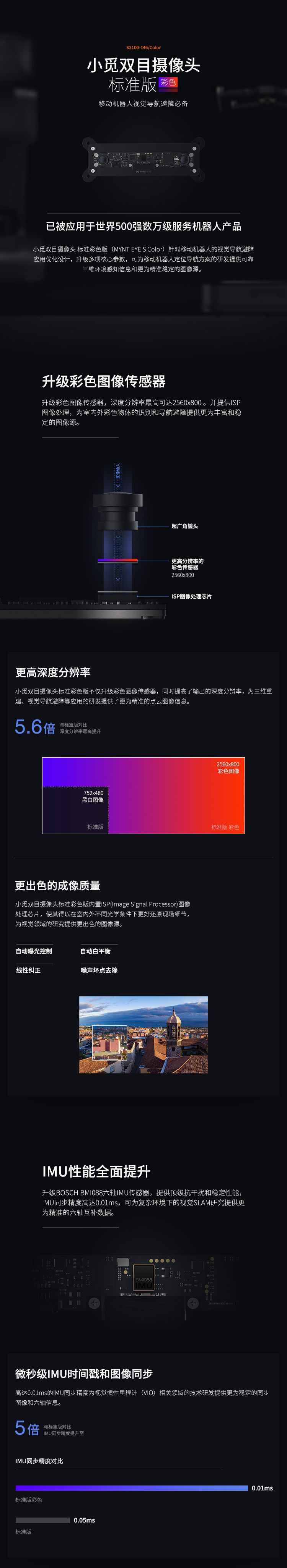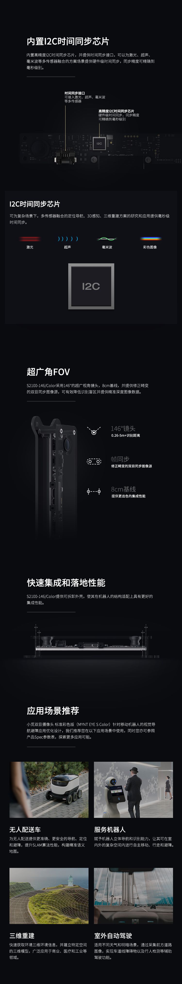 本周,mynt小觅旗舰店上架了小觅双目摄像头 标准彩色版的工程版本(S2100-146/Color),工程版采用146°超广视角镜头,并提供修正畸变的双目同步图像源,可有效降低识别盲区并提供精准深度图像数据。与此同时,标准彩色版(工程版)采用8cm基线,整体更为小巧轻量,并提供可拆卸外壳,使其在机器人的结构适配上具有更好的集成性能,从而更好地为下游企业节约人力物力,帮助产品更快落地。