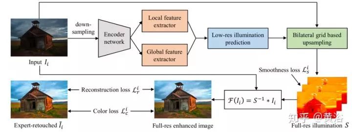 这是一种基于神经网络增强曝光不足照片的方法,其中引入中间照明(intermediate illumination),将输入与预期的增强结果相关联,也加强了网络的能力,能够从专家修改的输入/输出图像对学习复杂的摄影修整过程。基于该模型,用照明的约束和先验定义一个损失函数,并训练网络有效地学习各种照明条件的修整过程。通过这些方式,网络能够恢复清晰的细节,鲜明的对比度和自然色彩。