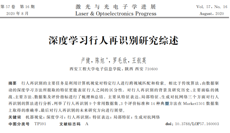 行人再识别的主要任务是利用计算机视觉对特定行人进行跨视域匹配和检索。相比于传统算法,由数据驱 动的深度学习方法所提取的特征更能表征行人之间的区分性。对行人再识别的背景及研究历史、主要面临的挑 战、主要方法、数据集及评价指标进行了梳理和总结。主要从特征表达、局部特征、生成对抗网络三个方面对行人 再识别的算法进行分析,列举了行人再识别9个常用数据集、3个评价标准和14种典型方法在 Market1501数据集 上取得的准确率,最后对行人再识别的未来研究方向进行展望。