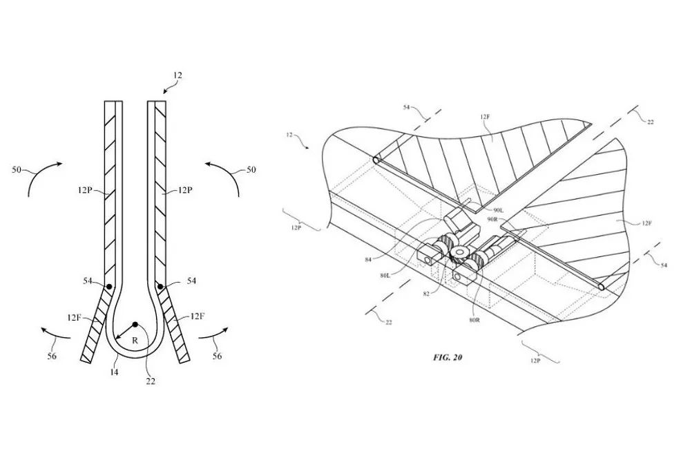 2021 年 3 月公布的这项专利显示,苹果设计了一个“带齿轮铰链的折叠屏设备”,通过齿形杆件和齿条,增强折叠屏设备的灵活性,同时防止屏幕因为过度弯曲、移动过快出现意外损坏,有些微软 Surface Duo 的意思。