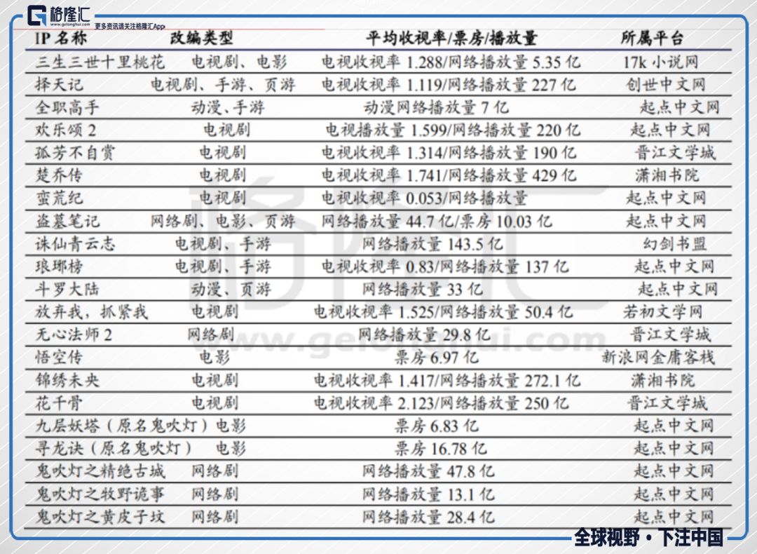 后来随着网络玄幻修仙题材剧的走红,比如《花千骨》的火爆,引起了业内对该类题材的关注,随后阅文集团开始尝试IP版权资源输出给影视剧制作公司,目前已经成功输出《鬼吹灯》、《盗墓笔记》、《琅琊榜》、《择天记》等大量优秀改编作品。