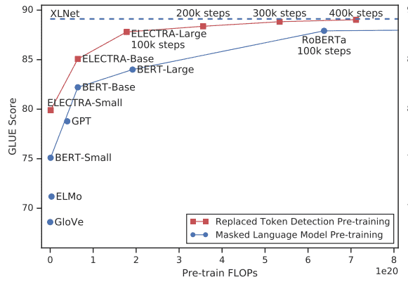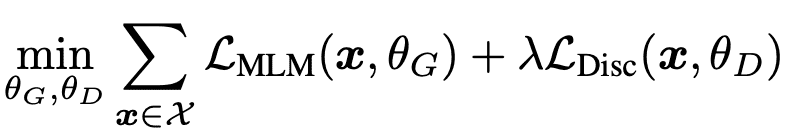 值得注意的是,此处的生成器 generator 的 MLM 是一个小型的模型,而不能是 BERT 这样大参数的模型。这是因为,如果 generator 过于厉害,判别式模型就很难学好。