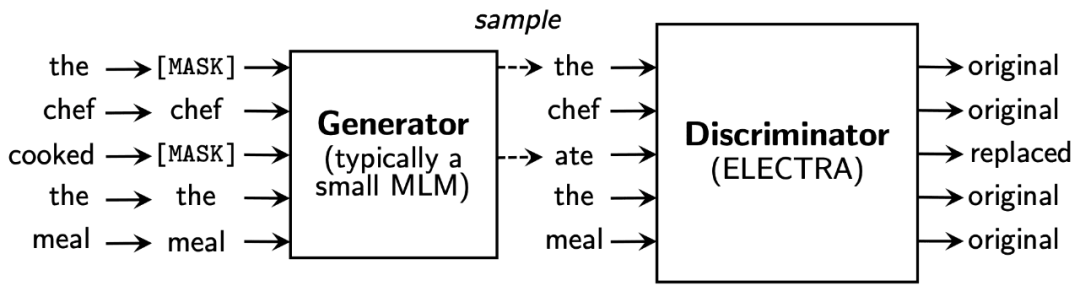 举一个例子:the chef cooked the meal(主厨烹饪了一餐饭)这个原句,经过 mask 和 generate 后,cooked 被替换为 ate,即“主厨吃了一餐饭”。虽然这个替换本身没有语法错误,但是从语境上判断,cooked 显然要和 chef 这个词关系更紧密,更符合语境。我们的目标,就是希望判别器也能学习到这些句子、乃至段落层面的语境理解,从而判断出 ate 是不恰当的替换。