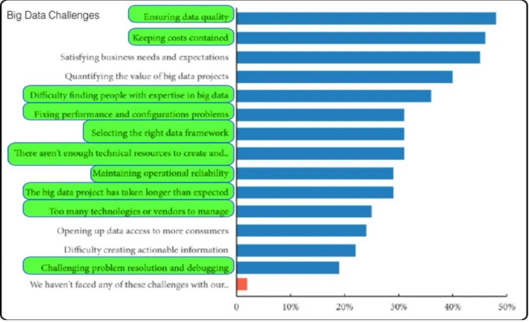 Dimensional Research 的一项调查(如上图所示)发现,对于想要实施大数据应用的公司来说,以下问题最为困难: