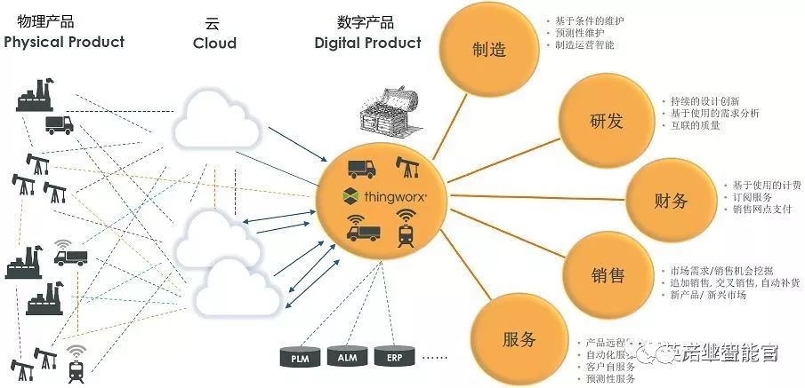 PTC公司一直推动数字孪生,甚至以“数物融合”作为公司的新发展战略,在一个更大的工业互联网场景中描述了数字孪生的作用,企业的物理产品都通过云服务,在Thingworx中建立了一个或多个数字孪生体,用于制造、研发、销售、服务、财务等各个业务环节。