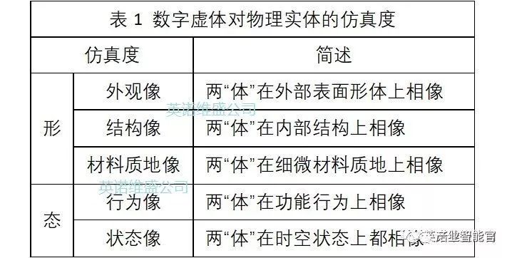 应该说,数字孪生是建设CPS的基础,是CPS发展的必经阶段。所谓建立数字孪生关系,就是以“软件定义”的方式,对物理实体(物理孪生体)建立了完全对应的数字虚体(数字孪生体),所创建的数字虚体经历了一个从其“形”、其“态”,逐渐向物理实体的“形、态”逼近的过程,直至看起来完全“相像”,如同同胞兄弟一般。在“相像”程度上,可以用不同级别的仿真度来衡量,如表1所示。