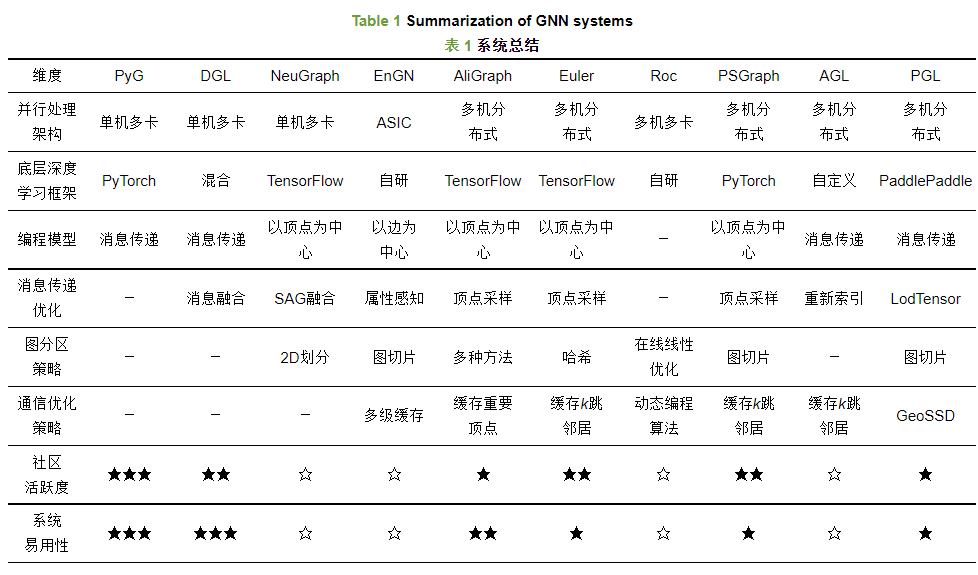 为了应对这些挑战, 出现了很多针对图神经网络的训练框架, 其中单机系统如PyTorch Geomertic、DGL、NeuGraph. 图神经网络通常处理非常大且不规则的图, 这些大图无法存储在单个设备中, 因此必须以分布式方式进行分区和处理, 其中分布式图神经网络框架如Euler、AliGraph、Roc、AGL. 接下来本文将介绍若干典型的单机图神经网络系统以及分布式图神经网络系统.