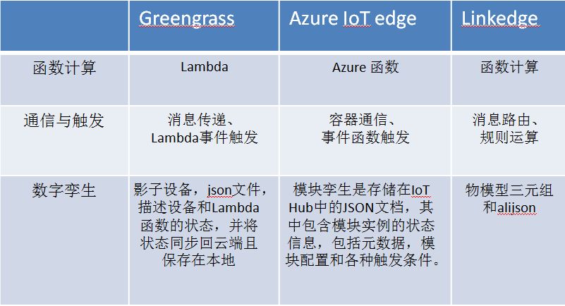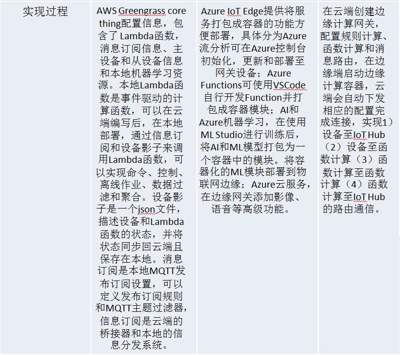 边缘计算是对于云计算的补充,边缘计算伴随着云服务而生,将云端的能力下降到边缘。通常边缘不需要处理所有数据,而是和云端协同,共同完成计算。所以所有的边缘计算实践都需要云端配置和边缘端部署。云计算厂商中AWS、微软和阿里云是边缘计算最早发力的。其中AWS推出了Greengrass,微软推出了Azure IoT edge,而阿里云则推出了linkedge等边缘计算工具。这些工具均实现了定义中所介绍的,将云端能力迁移到设备中,既可以在本地处理数据,又可以利用云端的优势。对这三家边缘计算平台的各方面作一比较: