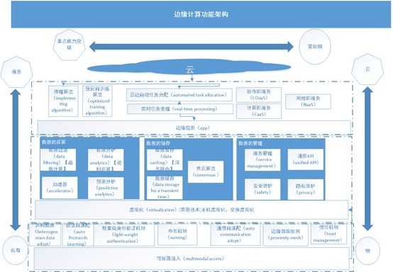 本层次的边缘计算架构是一个开放的系统,也就是说会有统一的API暴露,可以广泛接入所有生态系统种的设备,具有广泛的可拓展性。同时本层次的边缘计算是一个虚拟化,需屏蔽底层硬件差别。因此本层次边缘计算可以进行分布式的计算,对于临近的边缘计算服务器可以形成一个资源池,相互接触对方的计算、储存和网络资源。如临近的边缘服务器如有加速卡,可以将人工智能算法的训练能力开放出来,根据使用情况获取相应的报酬,储存资源和网络资源也是相似的。