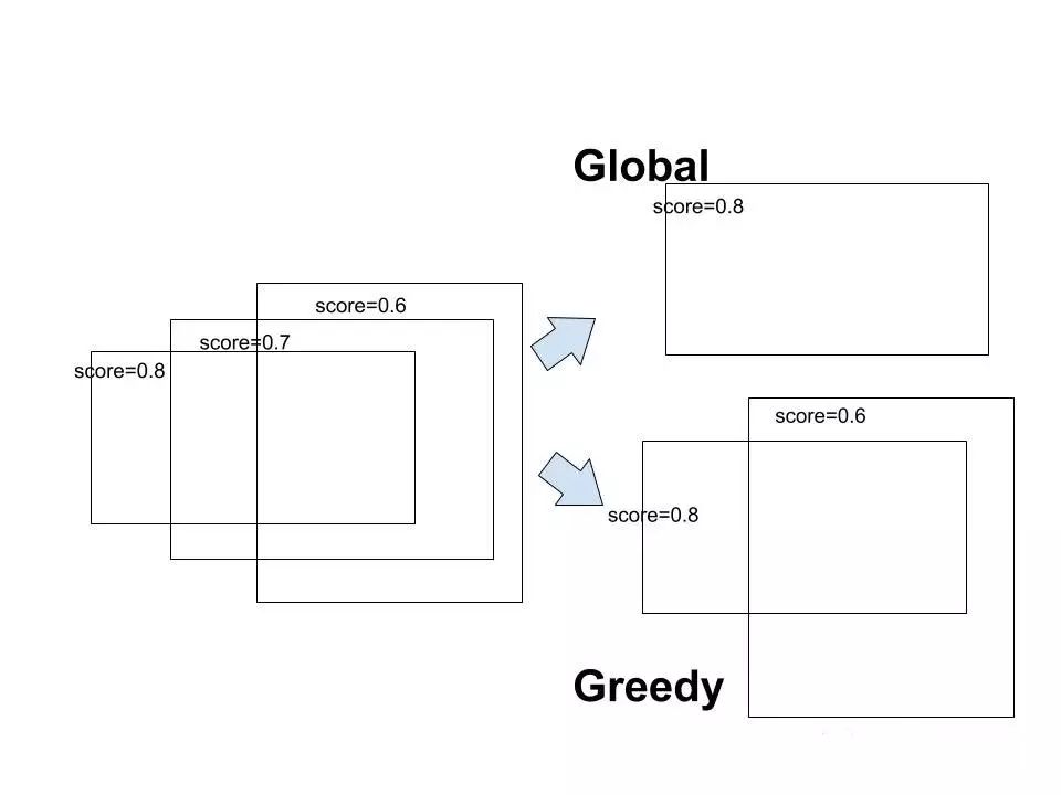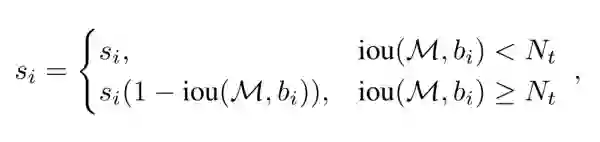 使用soft-NMS,在soft-NMS中score被乘以负向IOU,图示如下: