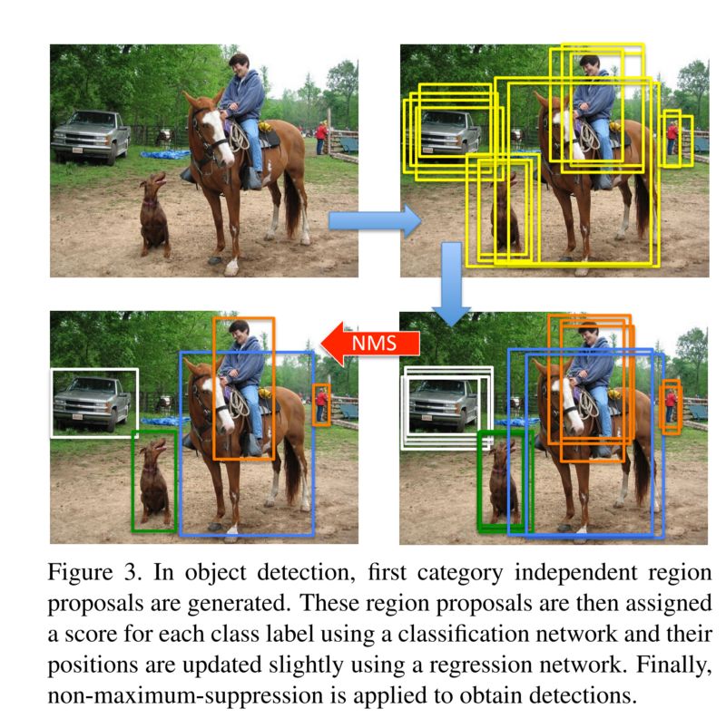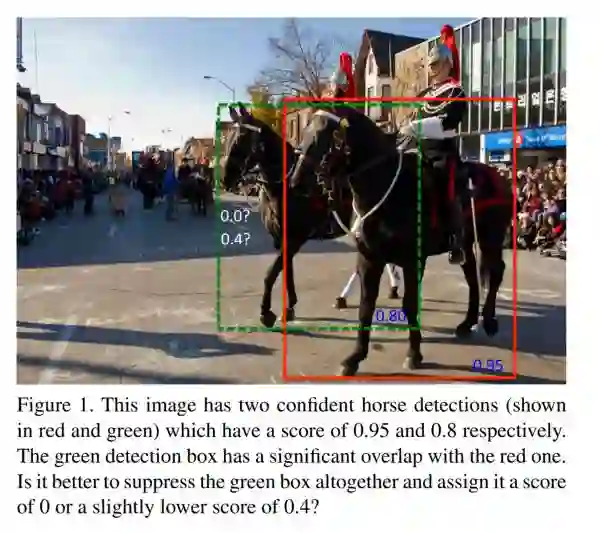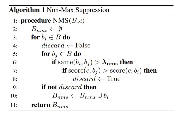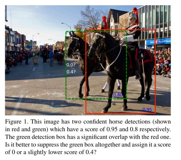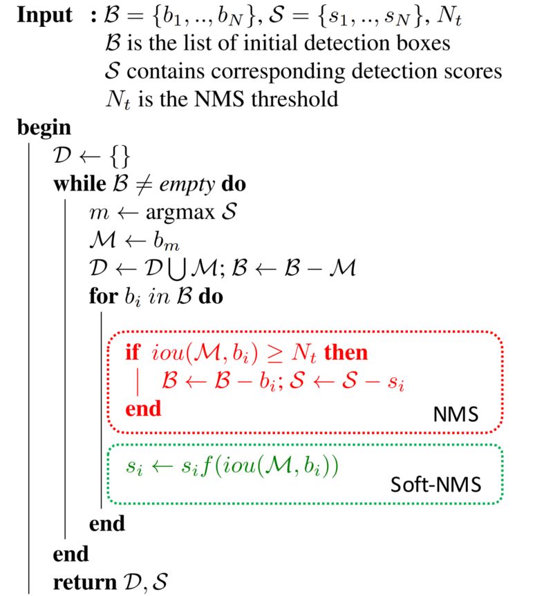 在一个典型的对象检测管道中,网络会在中间层输出很多候选框proposals(Bounding Box-BB)。在这个阶段输出的BB大多数都会关联同一个检测对象,这个时候需要一个方法来合并这些BB成为一个对象检测框,除了FP之外。Non-maximum-suppression(NMS)通过空间距离结合并交比(IOU)完成聚类划分,对每个cluster只保留得分最高的BB,这种方法中文也被称着-非最大抑制。