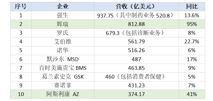 如业界预测的一样,2021年,辉瑞凭借其在新冠疫苗上的突出表现,以812.88亿美元的营收、95%的同比增长再次登顶。阿斯利康则以374.17亿美元、41%的同比增长排名第十。不得不提及的是,截至目前,阿斯利康已向180多个国家和地区发放了26亿多剂的COVID-19疫苗,其中约三分之二供应给中低收入国家。