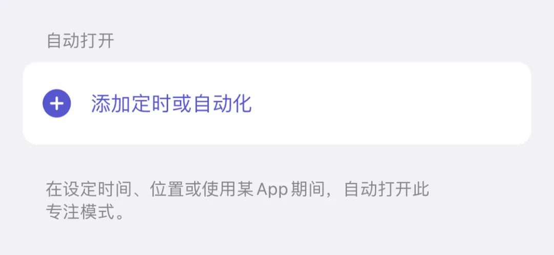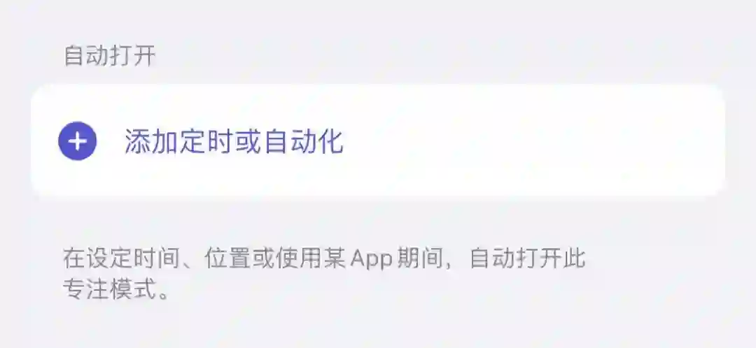 除了我们手动打开专注模式之外,我们还可以给它添加一些触发条件,让专注模式也实现自动化。在最下方的自动打开中,点击「添加定时或自动化」即可开始进行设定。