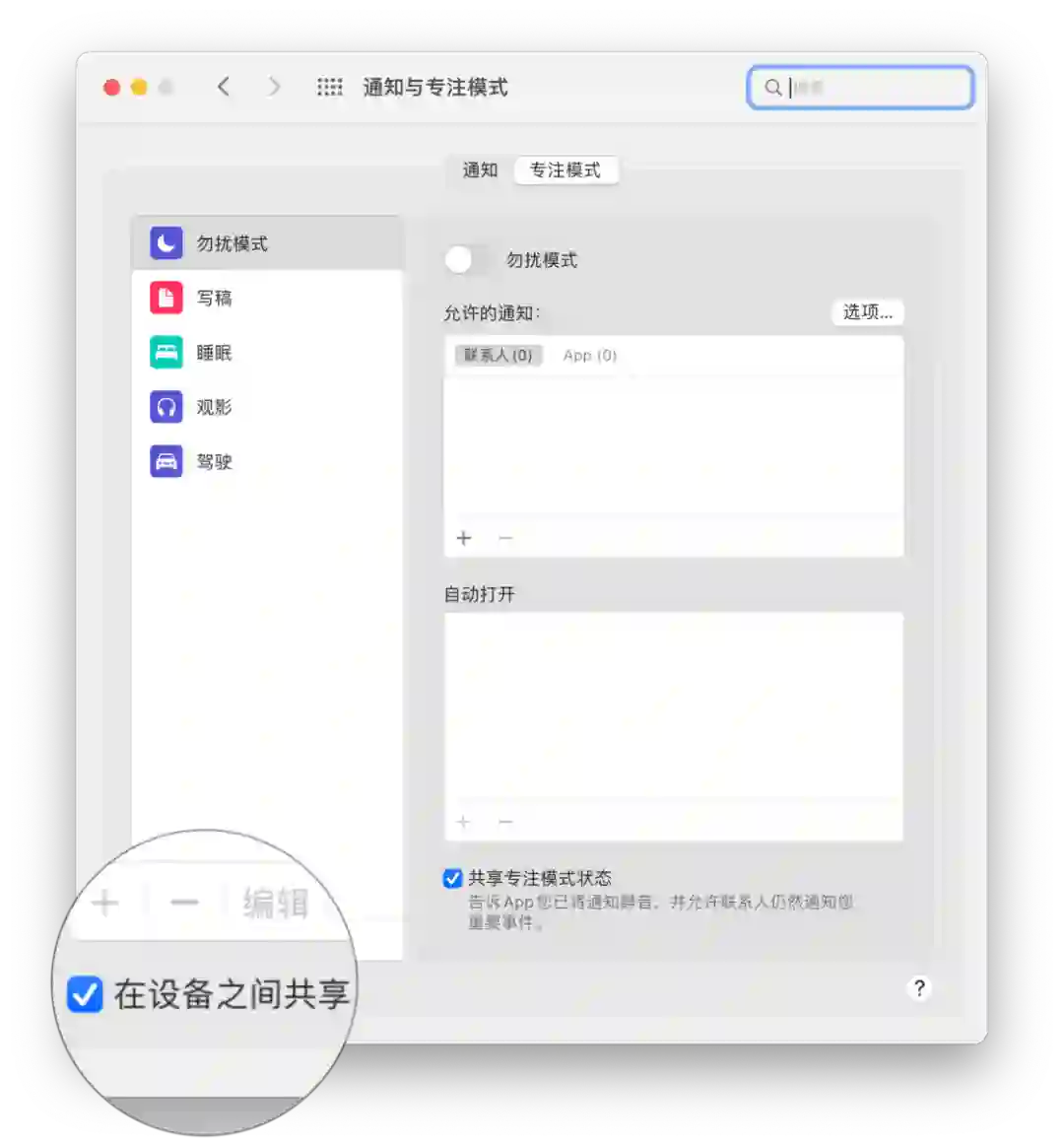 此外,这个开关你也可以在 Mac 的「设置 - 通知与专注模式 - 专注模式」的页面下找到它。