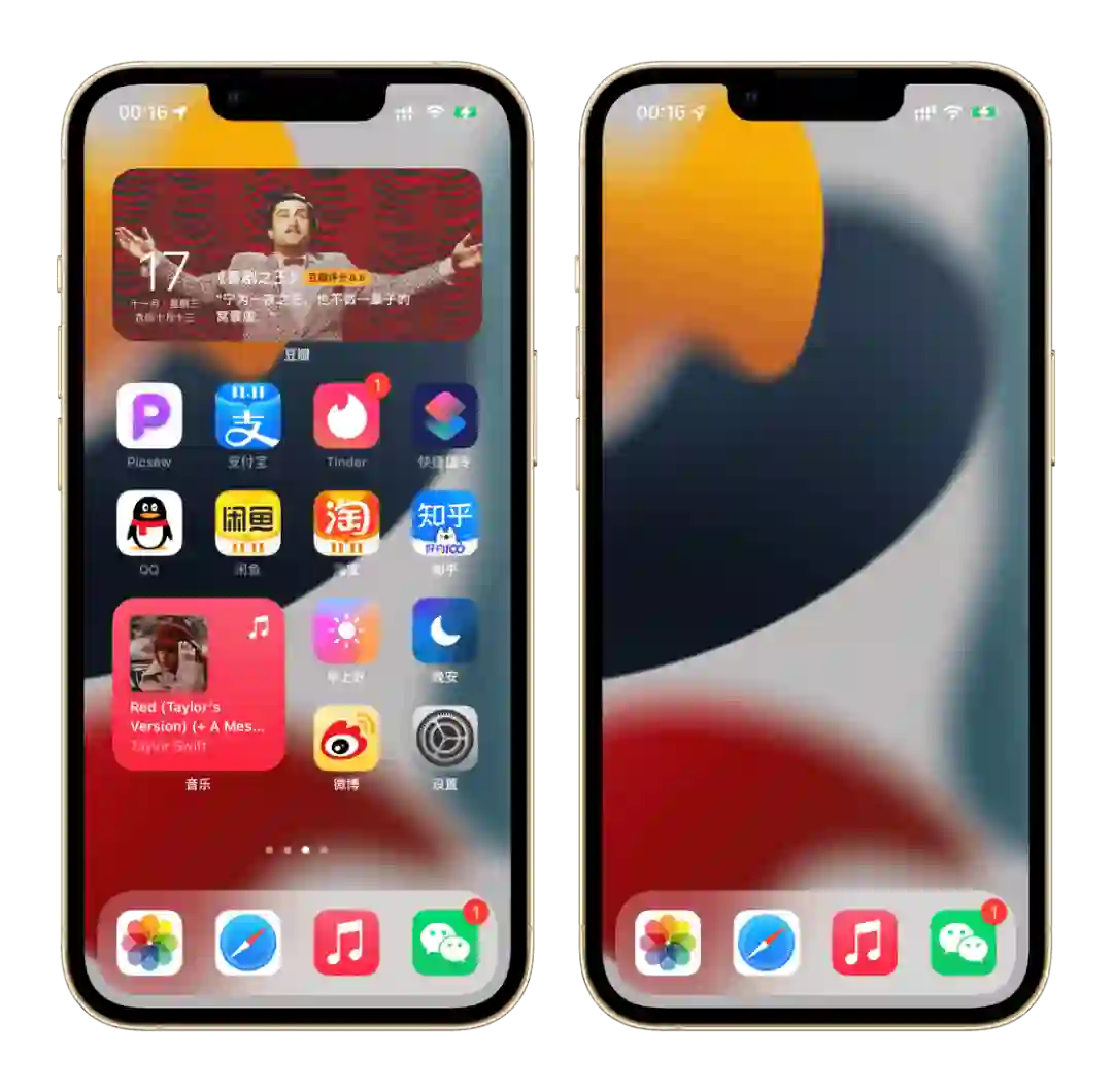 其二是主屏幕的第一页设为空白页,进入需要专注的模式时,其它有 App 和小组件的页面均全部隐藏,主屏幕页面上除了程序坞上的四个 App 外一片空白。