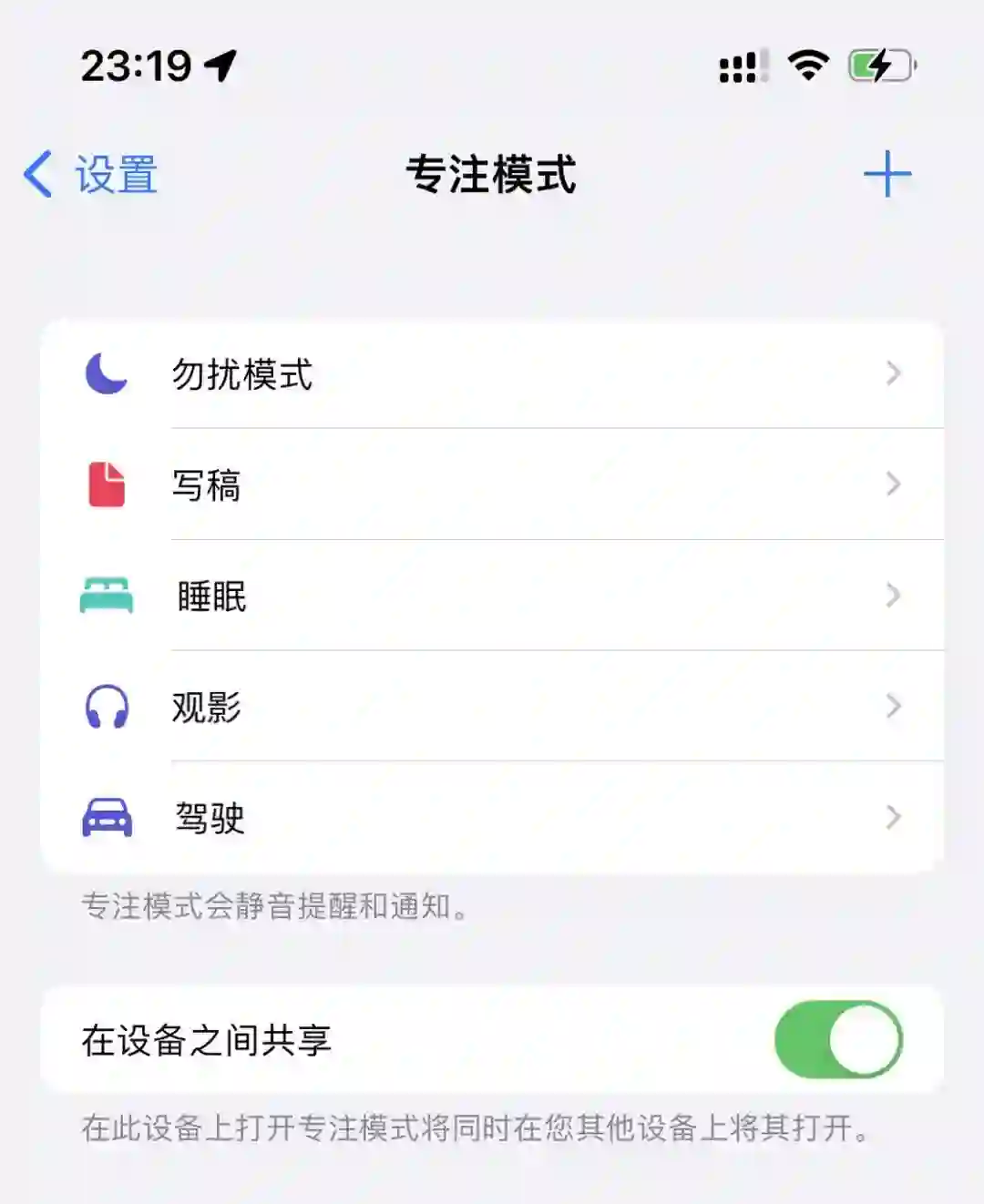 在专注模式的主页下方,打开「在设备之间共享」的开关并进入专注模式后,同一个 Apple ID 账号下的所有 iPhone、iPad、Mac 和 Apple Watch 设备都会进入这个专注模式,并共享这一模式下的所有设置。