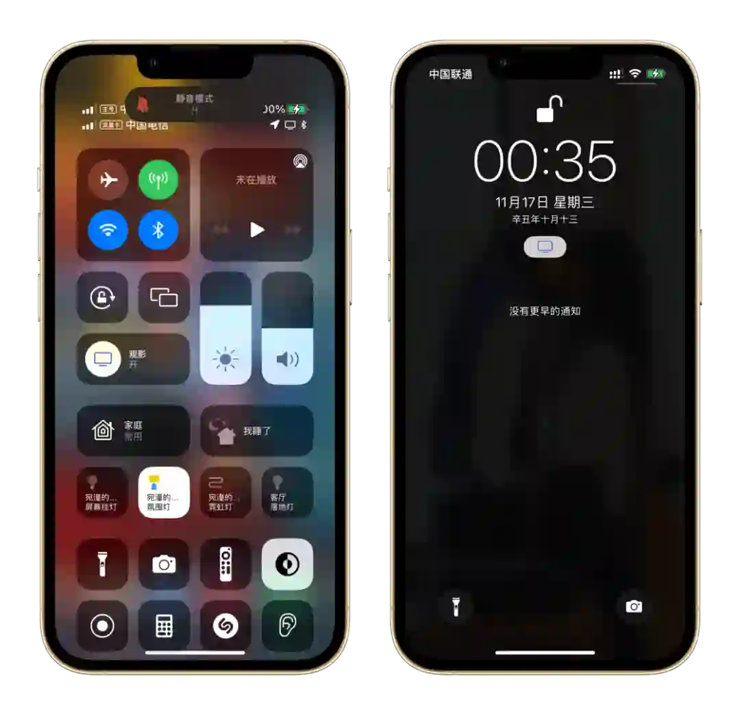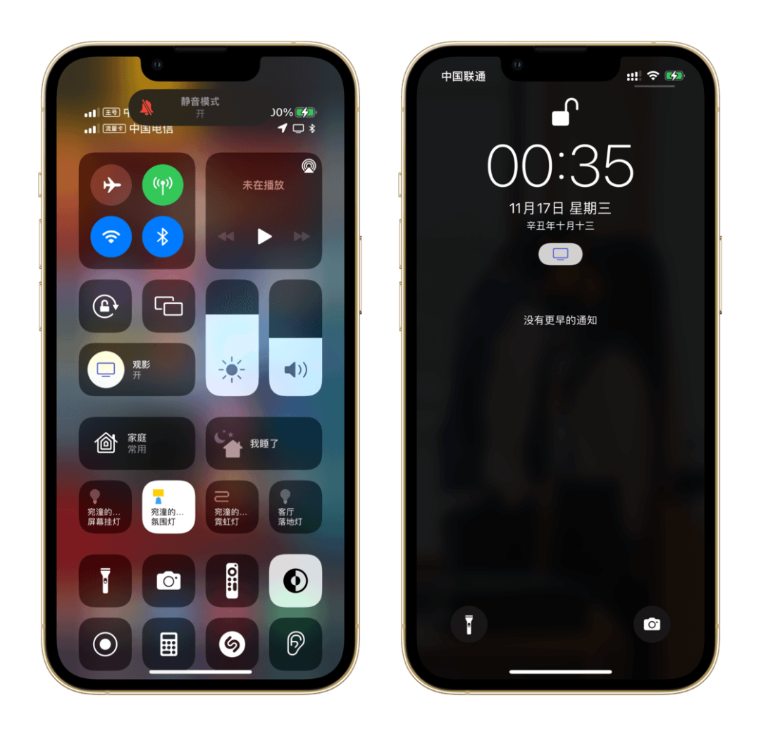 设置的方式与上文类似,这里便不再赘述。这里建议的是将锁屏设置下的「锁屏变暗」和「在锁定屏幕上显示」打开,并结合快捷指令将设备调整为深色模式和静音模式,同时调低设备的屏幕亮度,这样一来即使是有通知推送或电话拨入时,既能做到应有的提醒,也不会影响到同一场合下的其他人的观影体验。