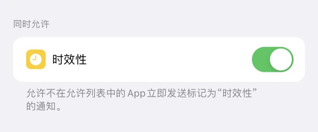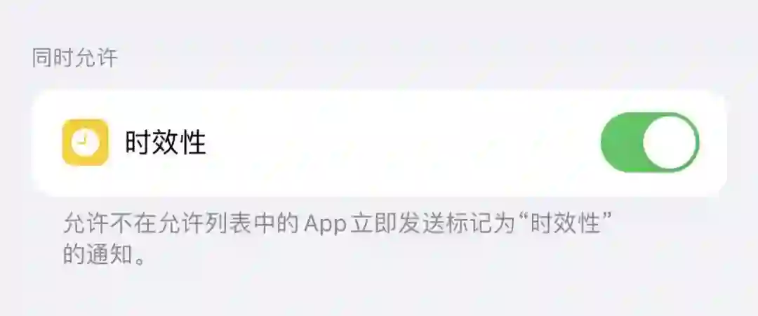 在允许的通知页面下,我们可以选定特定模式下允许给我们来电和发送消息的联系人或 App。这一部分的内容相信大家不难理解,这里便不展开细讲。不过在 App 页面的下方,有一个「时效性」的开关,一时间会让不少人感到懵。