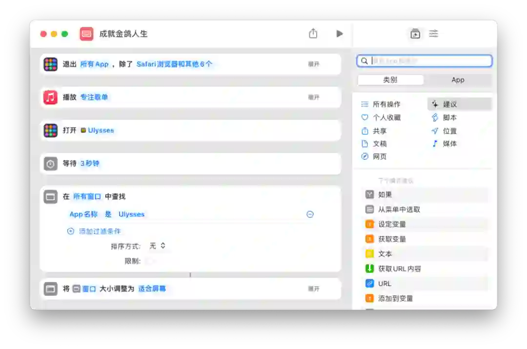 我们利用快捷指令的操作,关闭掉电脑上其他多余的 App,并打开 Ulysses。由于前面设定了打开 Ulysses 时自动唤醒写稿模式,因此这里甚至可以省略掉一个进入专注模式的步骤。接着,快捷指令再将 Ulysses 设置成全屏幕,然后播放专注歌单,就可以开始认真写作了。