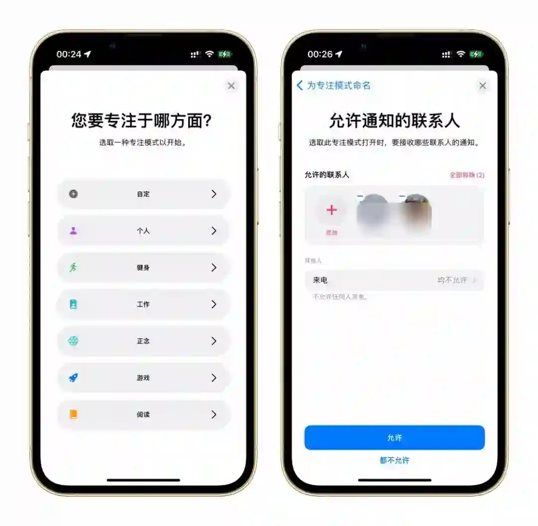 这一部分适合都在使用 iPhone 的情侣们。相信在你们独处时,肯定不希望被老妈打电话问吃了没,被老师发微信问作业交了没,被老板发钉钉问 PPT 做完没 —— 因此,设定一个「恋爱模式」,把他们统统踢出去,只留下一个专属于两个人的时间吧。