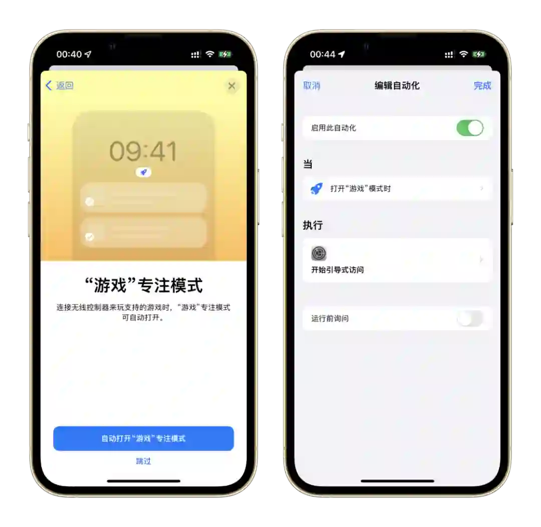此外,我们还可以设置一个引导式访问,并通过快捷指令自动化的方式,设置成进入游戏模式时自动打开。这样一来,我们在游戏时便会被锁定在当前的 App,避免一些需要在屏幕下方进行的操作时,误触发返回主屏的手势。