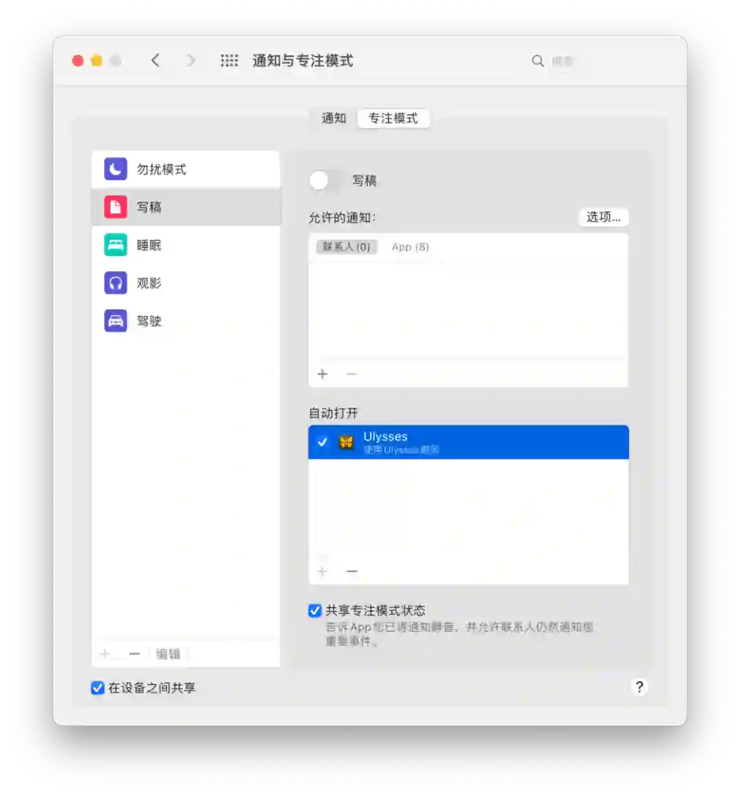到这里,一个专注模式就差不多设置好了。但是到现在,它还不够「智能」,所以现在我们就需要转移到 Mac 上来继续进行设置。通过在下方的自动打开选项中,添加 Ulysses 这个 App,就能做到让我在打开且前置这个窗口的时候,让所有的设备一同进入写稿模式。