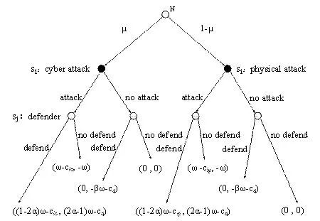 以上针对智能电网安全性的研究,大多数没有考虑同时存在网络攻击和物理攻击两种类型攻击者的情形。针对系统管理员 (防护者) 如何确定攻击者的类型,从而选择最优防护策略的安全问题,本文提出一种贝叶斯序贯博弈模型来确定攻击者的类型,从而选择最优防护策略,为系统管理员 (防护者) 及时地提供决策分析。首先,对事先不确定类型的攻击者和防护者构建静态贝叶斯博弈模型。通过海萨尼转换,使得防护者知道攻击者类型的概率分布,将不完全信息博弈转换成完全信息博弈进行分析。防护者以μ的概率知道攻击者类型是网络攻击,其中,μ可以通过智能电网的网络组件和物理组件占整个电网系统的比值计算。经过贝叶斯博弈分析,可以根据攻击者类型为网络攻击的概率和贝叶斯纳什均衡解,确定攻击者的类型。