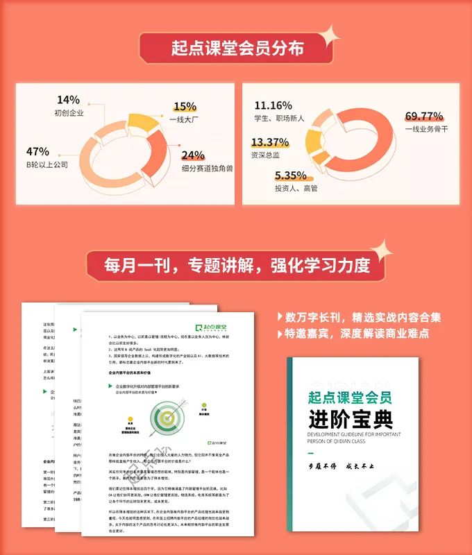 人脉任意勾搭:加入起点课堂会员后,会有专门的VIP会员专属社群,成员都是来自各大赛道头部企业。经调查有47%的同学在B轮以上的公司工作,24%的同学在细分赛道的独角兽公司,还有15%的同学来自BAT、TMD这些互联网大厂。