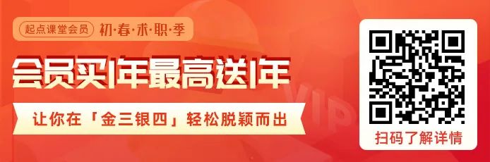 为了助力大家在金三银四里斩获理想offer,成功升职加薪,开启更精彩的未来!我们起点课堂会员特地精心准备了护航金三银四活动,即「会员买1年最高送1年!」最高可承包你未来两年的职场提升学习计划!