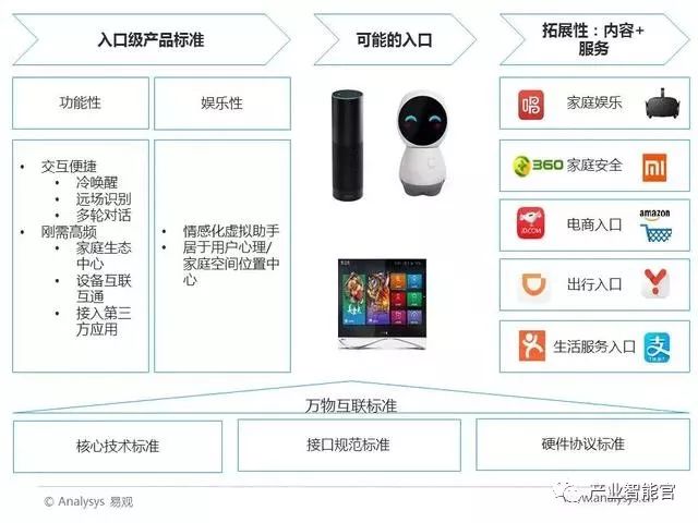 Analysys易观分析认为,找到合适的语音入口是挖掘智能家居背后用户价值的关键。硬件本身具有入口价值,智能音箱、智能电视、家庭机器人等都有可能成为合适的入口。通过前端语音交互提供入口,后端互联网提供服务的方式完成物联网时代家居场景下的商业模式转换。