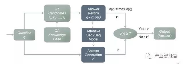 在我们的聊天引擎中,结合检索模型和生成模型各自的优势,提出了一种新的模型AliMe Chat [23],基本流程如图13所示。首先采用检索模型从QA知识库中找出候选答案集合;然后利用带注意力的Seq2Seq模型对候选答案进行排序,如果第一候选的得分超过某个阈值,则作为最终答案输出,否则利用生成模型生成答案。其中带注意力的Seq2Seq模型结构如图14所示。经过训练后,主要做了如下测试:如图15所示,利用600个问题的测试集,测试了检索(IR)、生成(Generation)、检索+重排序(Rerank)及检索+重排序+生成(IR+Rerank+Generation)四种方法的效果,可以看到在阈值为0.19时,IR+Rerank+Generation的方法效果最好。