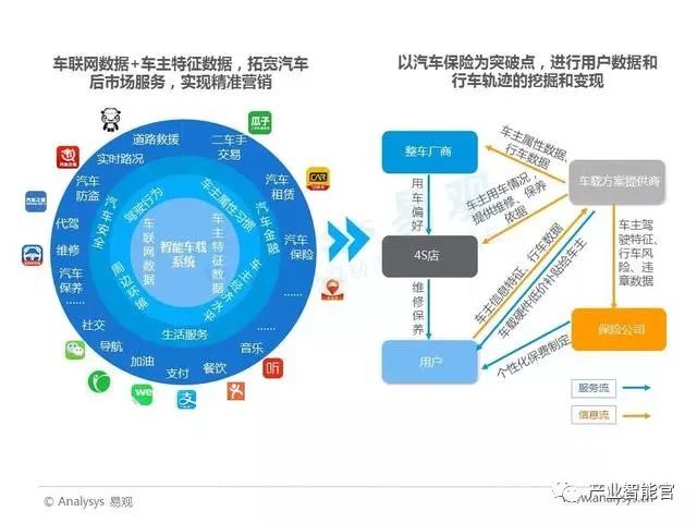 而未来,车载设备提供商可以通过补贴用户来抢占汽车内显示屏市场,通过用户用车行为数据的搜集与挖掘,为保险公司和车厂提供信息,保险公司根据数据设立分层级的保费机制,激励规范驾驶行为。这样,信息流和服务流将不断在生态系统中流转,不断挖掘更大价值。