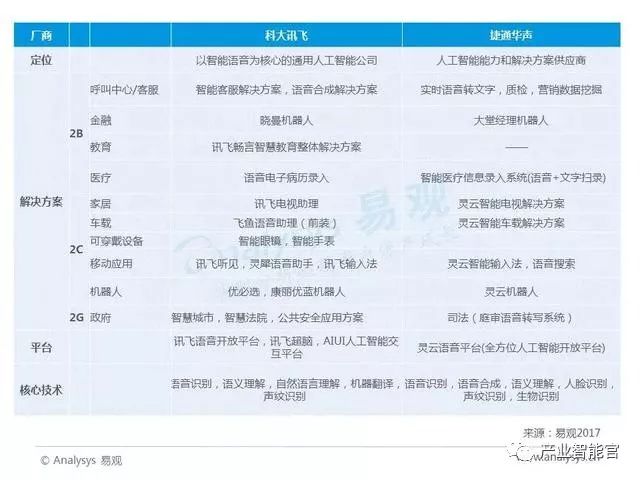 在国内专注智能语音技术的公司中,有两家厂商值得关注。一家是科大讯飞,另一家是捷通华声。这两家企业在前期业务以运营商,金融等行业客户和政府为主。后期开始发力智能家居,智能车载等领域。从单一的智能语音技术商全面转型人工智能技术服务商。