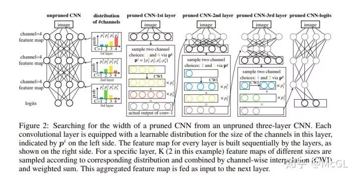 剪枝后网络的宽度和深度根据每个分布中网络大小的最大概率得到。 这些参数是通过knowledge transfer从原始网络中学习到的。 模型在 CIFAR-10、 CIFAR-100和 ImageNet 上进行了实验。
